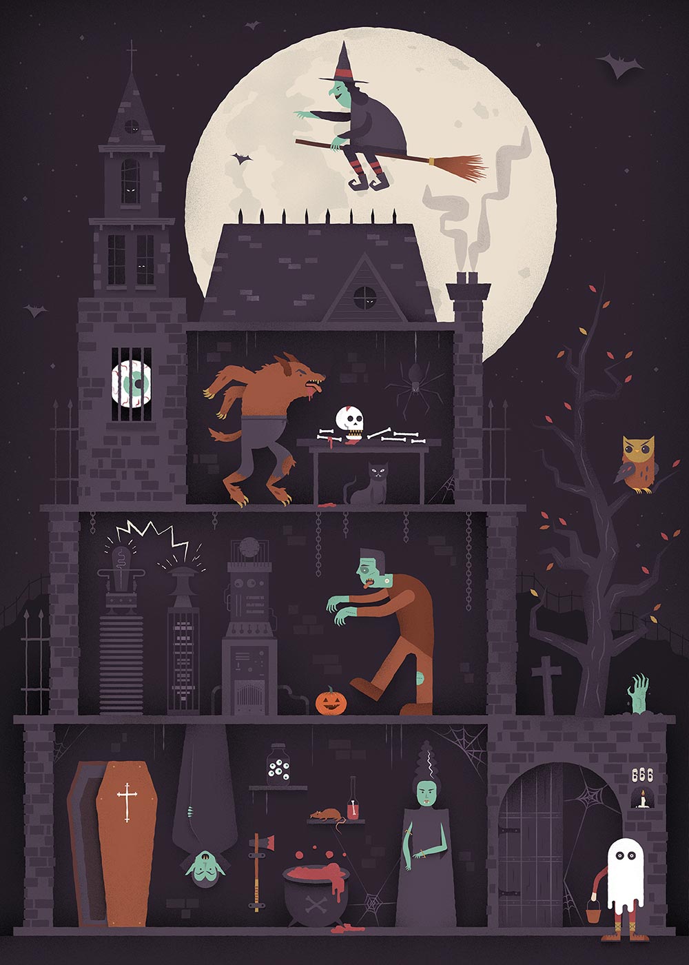 I then went on to work on each element in further detail and iterate on various layout ideas. The final one being a haunted house with different layers containing all of the Halloween characters and objects.